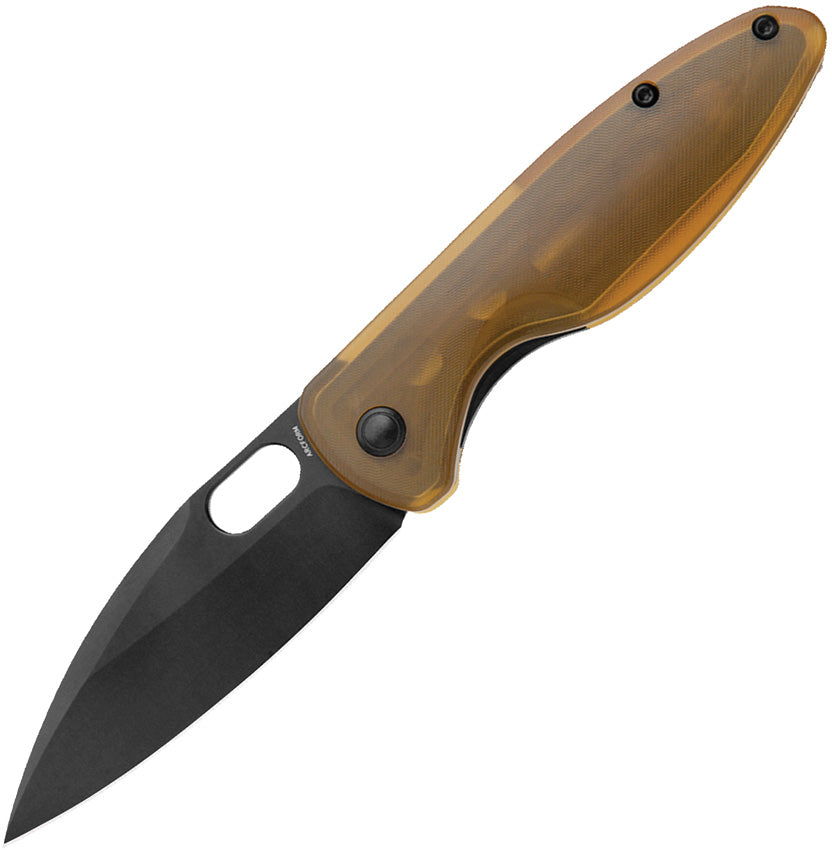 4" (10.16cm) closed. 3.25" (8.26cm) black stonewash finish CPM-20CV stainless leaf shaped blade. Ultem handle. Thumb pull. Pocket clip. Ultem backspacer. Boxed.