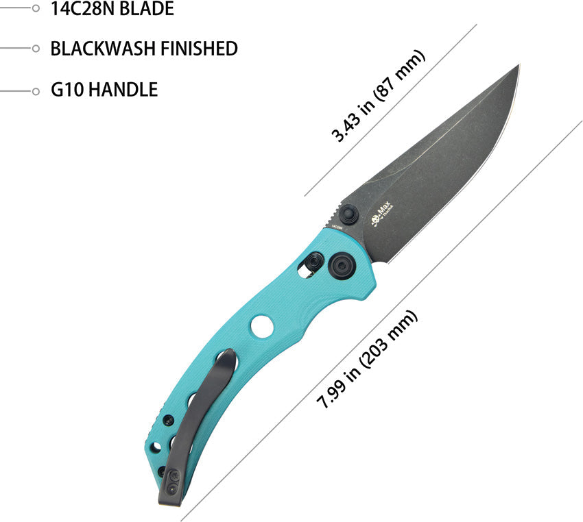 4.5" (11.43cm) closed. 3.5" (8.89cm) black stonewash finish 14C28N Sandvik stainless blade. Tiffany blue G10 handle. Thumb stud. Lanyard hole. Pocket clip. Boxed.