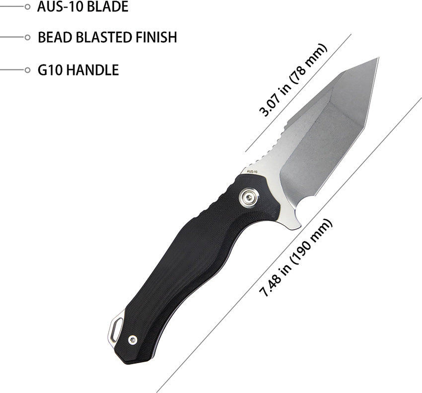 7.5" (19.05cm) overall. 4.5" (11.43cm) satin finish AUS-10A stainless blade. Black G10 handle. Full, extended tang. Lanyard hole. Black Kydex belt sheath. Boxed.