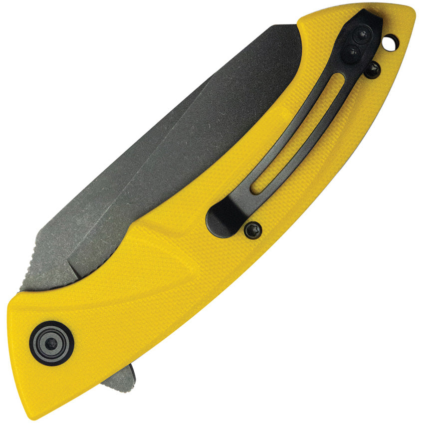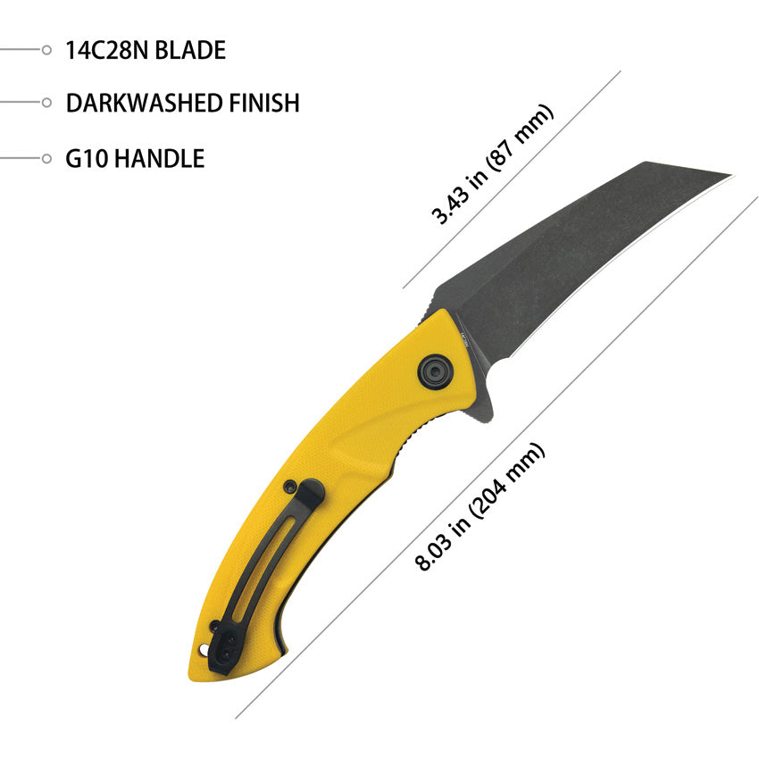 4.63" (11.76cm) closed. 3.5" (8.89cm) black stonewash finish 14C28N Sandvik stainless blade. Yellow G10 handle. Extended tang. Lanyard hole. Pocket clip. Boxed.
