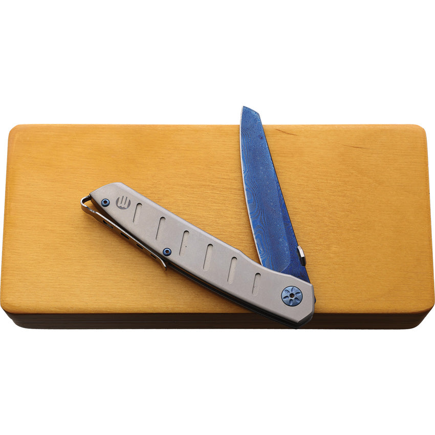 4.88" (12.4cm) closed. 3.75" (9.53cm) Blue Atti coated Damascus steel blade. Bead blast finish titanium handle. Thumb disk. Pocket clip. Damascus is forged from a canon barrel from the Leopard I tank as well as tool steel, cold work steel, and roller bearingÊsteel.