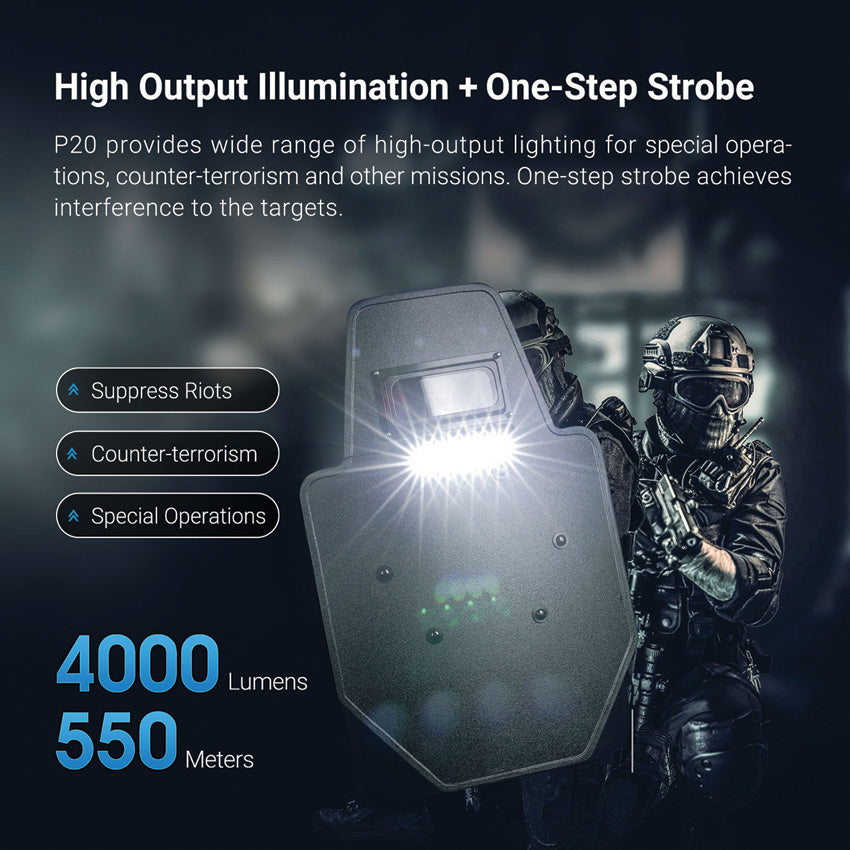 Dimensions: 7.25" x 3.38" x 2.13". Water resistant. Impact resistant. OSRAM P9 LED. Modes: Constant On (4000 lumens, 2h 45m runtime); Strobe (4000 lumens, 3h 45m runtime). 550m beam distance. LED power indicators. Type-C direct charge. Various installation methods. Remote dual switch. 360 degree rotary focus adjustment. Requires (2) 21700 batteries (included). Aluminum construction. Color: Black. Hardside carrying case.