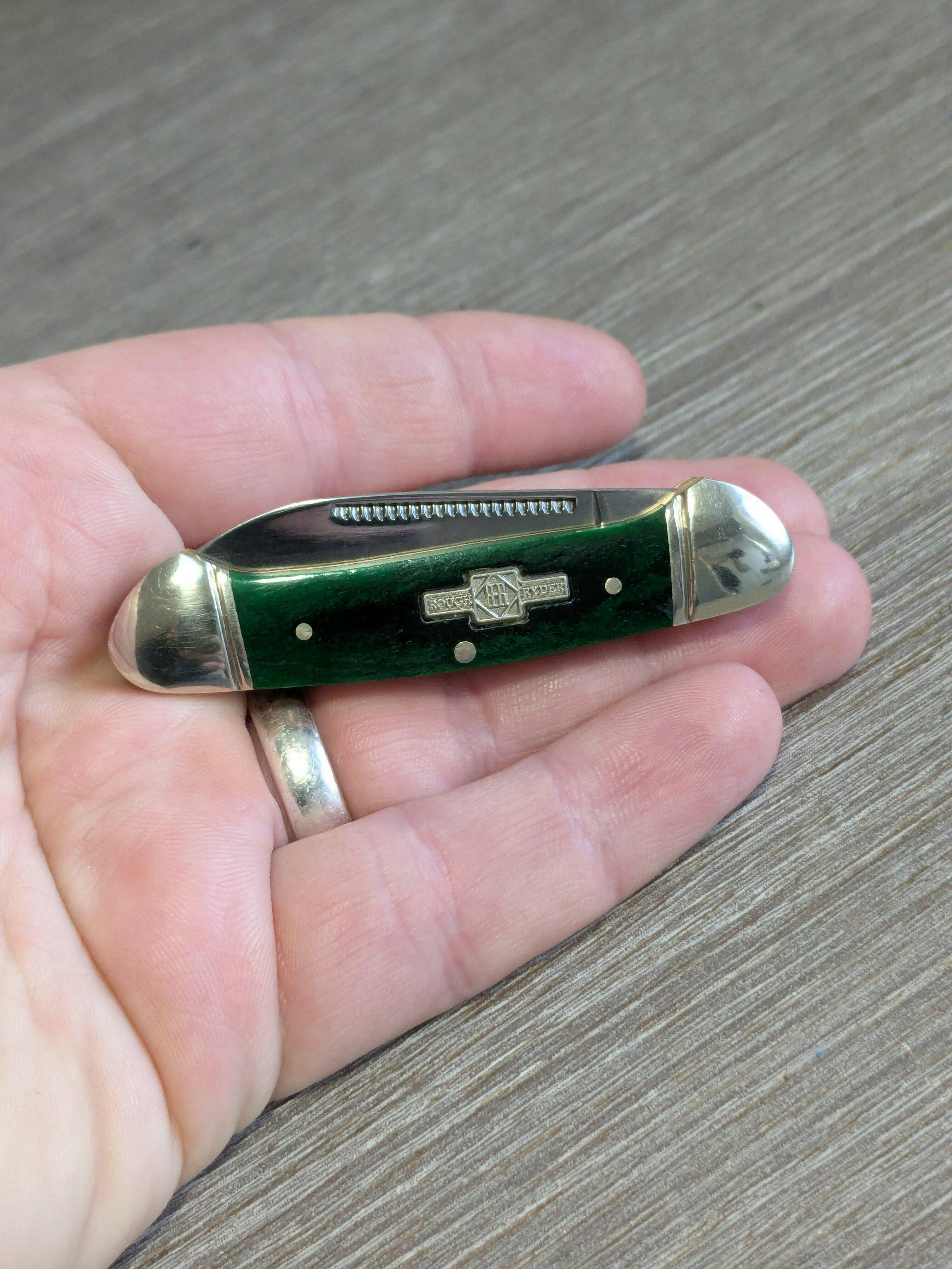 2.75" closed. Stainless spear and pen blades. Green smooth bone handle. Nickel silver bolster(s). Inlay shield. Boxed.