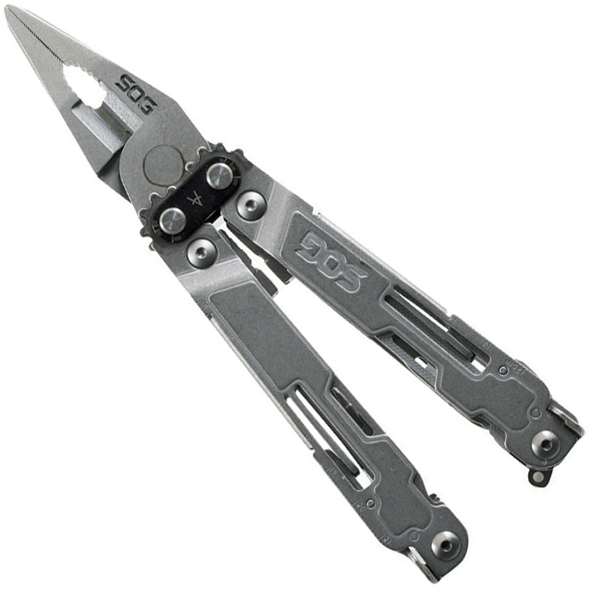 5" closed. 6.8" overall. Stainless handle. Tools include: Needlenose pliers l Wire cutter l Large blade l Ruler l Bottle opener l Small screwdriver l Serrated blade l Wire crimper l File l Metric ruler l Awl l Can opener l Mini screwdriver l Phillips screwdriver l Saw blade l Bolt gripper l Protractor l Jewelry driver l 1/4" drive l Chisel l Magnetic bit holder. Includes 12 piece hex bit set. Black synthetic belt sheath. Boxed with hanging tab.