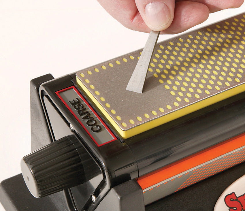 EdgeSport Series. 12" x 6 1/8" x 5" base. Black composition housing with black non-slip rubber feet. SmartSharp features. 8" x 2 1/2" coarse and fine diamond stones and natural arkansas finishing stone. Interrupted surface speeds sharpening. Features Micro-Tool Sharpening Pad - this area allows you to sharpen those small tools and instruments that require an uninterrupted sharpening surface. Non-petroleum based honing solution. Angle guide. Sharpens knives and tools.