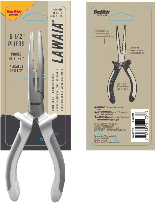 7" (17.78cm) overall. 3.25" stainless pliers. Split shot crimper. Side cutters. Leaf spring. White and gray TPR handles. .