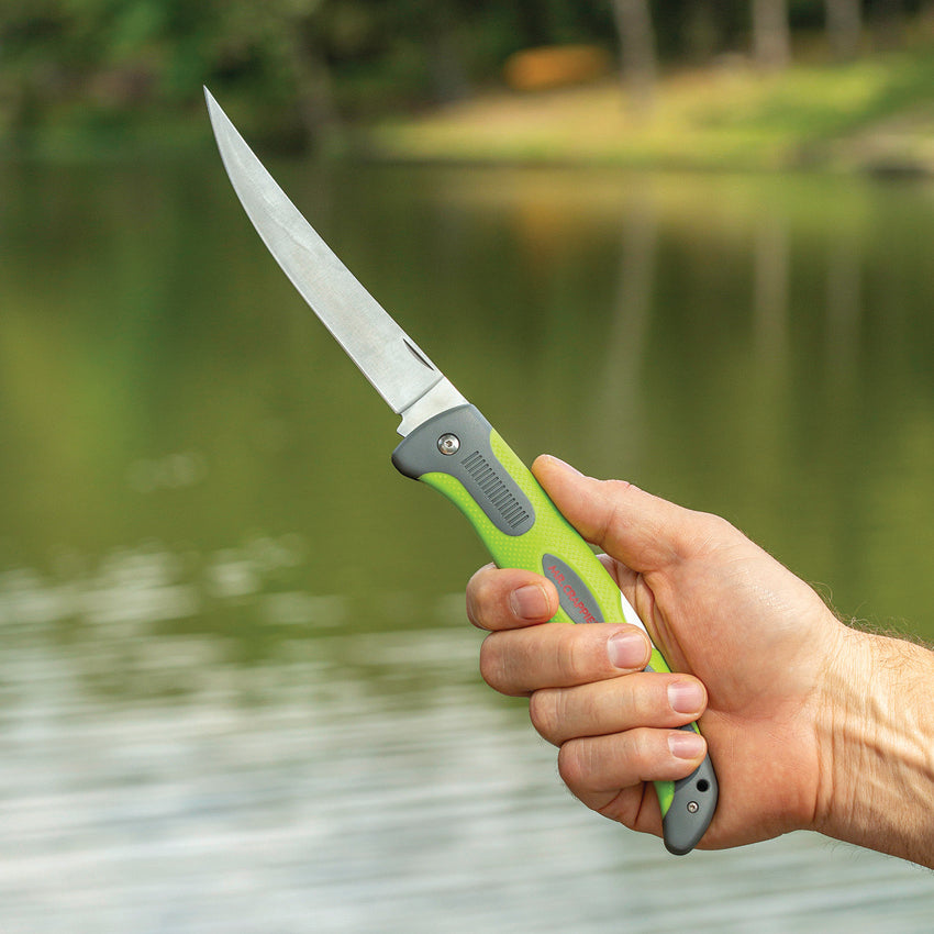 7.25" (18.42cm) closed. 6" (15.24cm) satin finish 3Cr13 stainless fillet blade. Green and gray nylon handle. Lanyard hole. Clam packed.