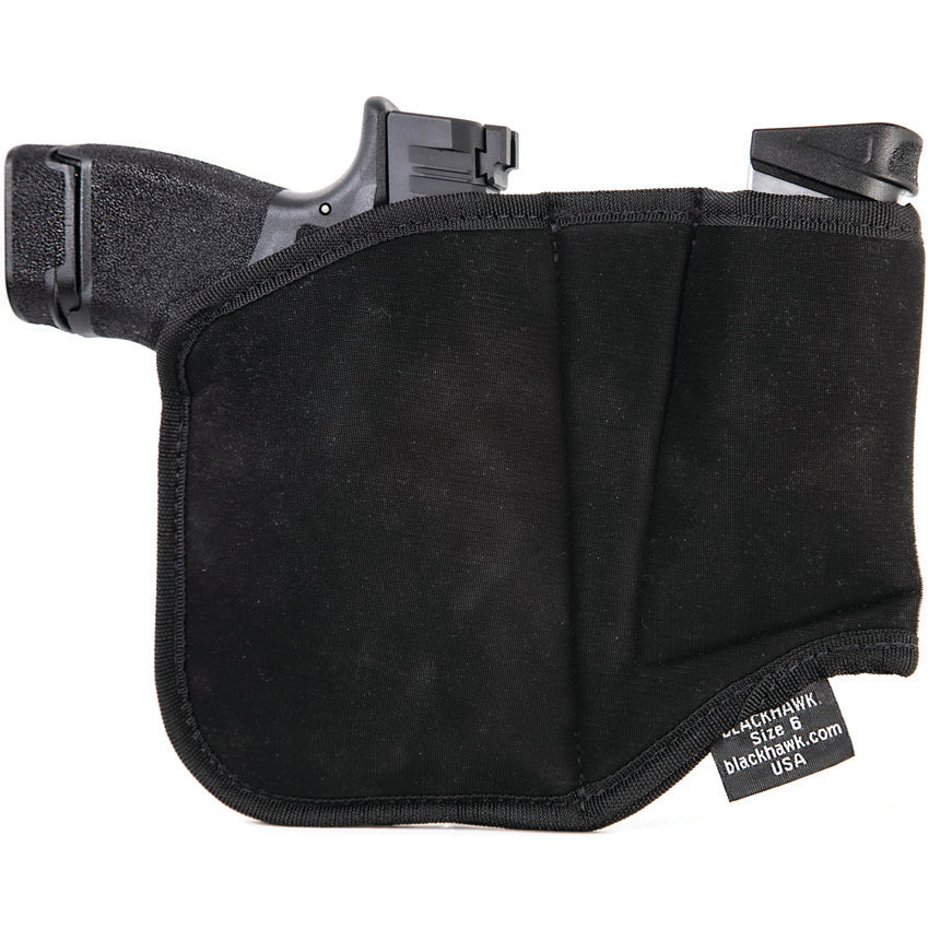 Size 5 (GLOCK 43/43x; Shield 9/.40/.45; Hellcat, LC9 and small frame 9/.40/Sig P365). Thermal bonded three layer laminate construction. TecGrip fabric allows for clipless carry. Ambidextrous and multi-fit. Hand washable. Color: Black. Boxed with hanging tab.