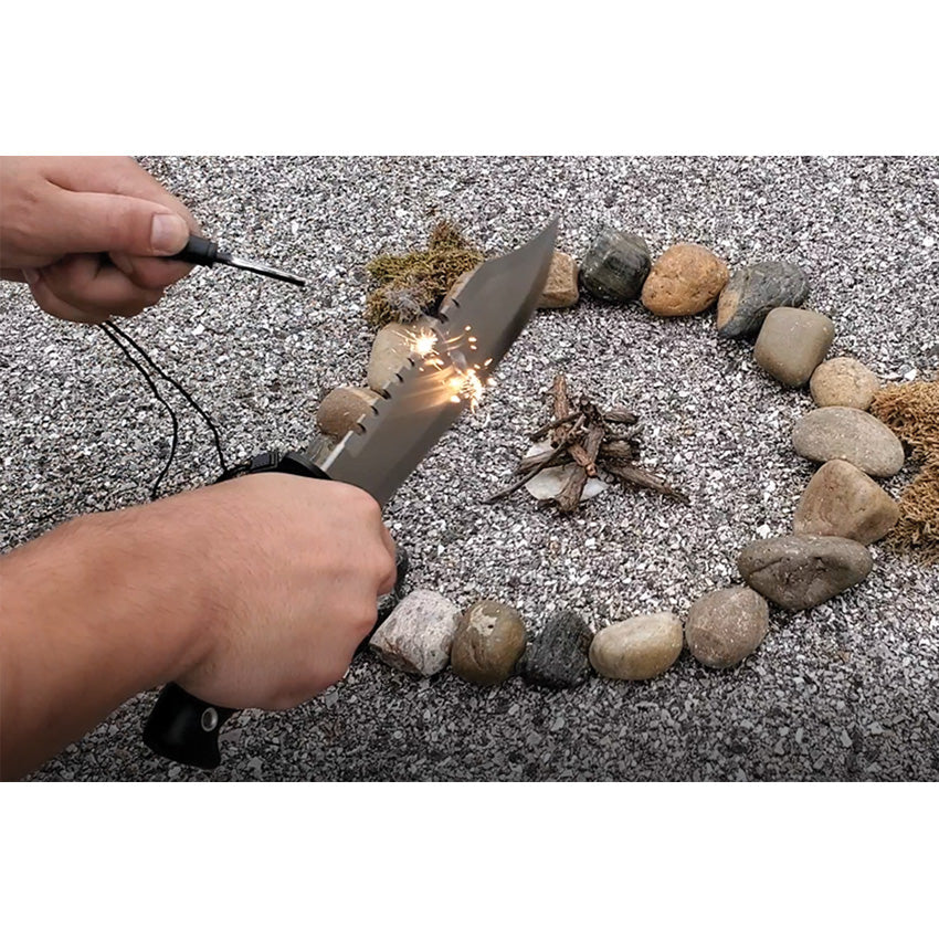 15" (38.1cm) overall. 10" (25.4cm) satin finish sawback 440 stainless blade. Black ABS handle. Stainless guard. Lanyard hole. Comes with fire starter and sharpener with cord lanyards. Black nylon belt sheath. Boxed.