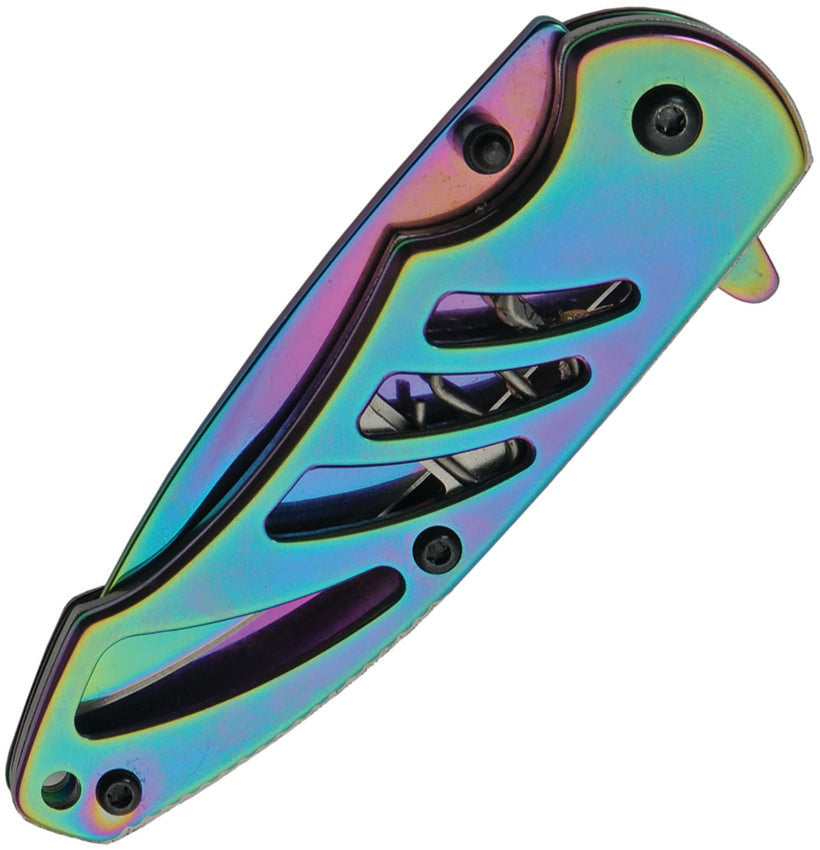3.5" (8.89cm) closed. 2.5" (6.35cm) spectrum TiNi coated stainless blade. Spectrum TiNi finish stainless handle. Extended tang. Lanyard hole. Pocket clip. Thumb stud. Boxed.