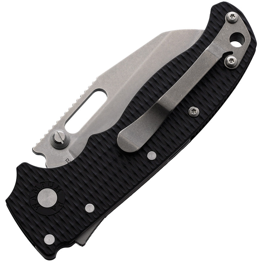 4.38" (11.13cm) closed. 3.25" (8.26cm) stonewash finish D2 tool steel Wharncliffe blade. Black checkered G10 handle. Thumb stud. Thumb pull. Lanyard hole. Pocket clip. Comes in plastic tube.
