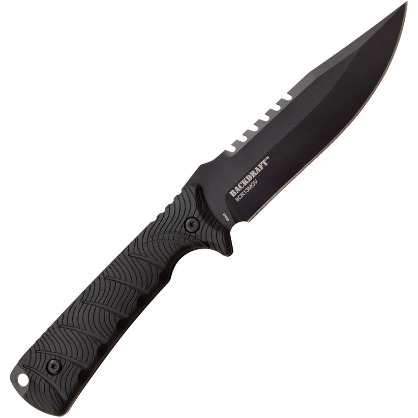 10" (25.4cm) overall. 5" (12.7cm) black finish stainless blade. Black rubber handle. Full, extended tang. Lanyard hole. Black nylon belt sheath. Boxed.