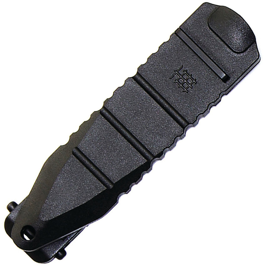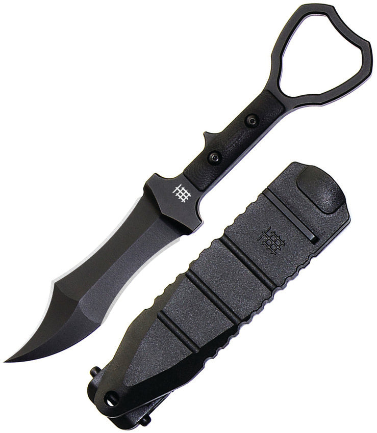 7.75" (19.69cm) overall. 4" (10.16cm) black Teflon coated Bohler K110 stainless talon blade. Black G10 handle. Full, extended tang. Beveled ring design with concave thumb recess. Live edge identifier at the three-quarter length of the handle. Developed in collaboration with Special Operations CQC instructor Jared Wihongi. Black molded plastic MOLLE compatible belt sheath. Boxed.