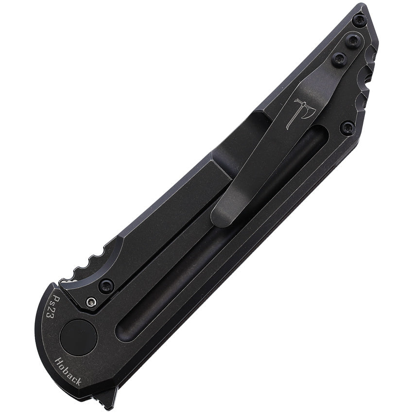 5.25" (13.34cm) closed. 3.75" (9.53cm) black DLC coated Bohler M390 stainless tanto blade. With black titanium back handle. Extended tang. Pocket clip. Red Ultrex SureTouch front handle. Wooden storage box.