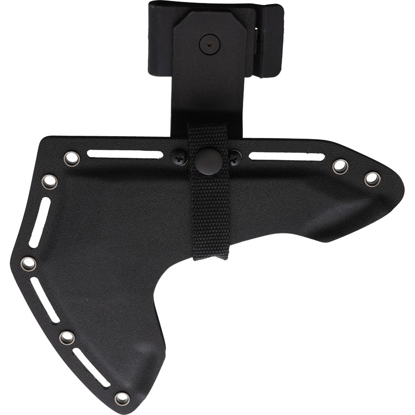 15.5" overall. 7" black DLC coated AEB-L stainless axe head with 5.25" cutting edge. Full tang. Lanyard hole. Spike end. Unidirectional textured carbon fiber handle with green anodized titanium bolts. Black Kydex belt sheath. Bulk packed.