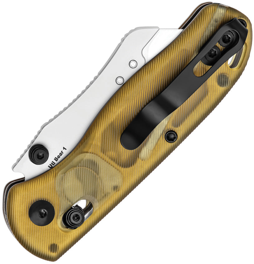 4" (10.16cm) closed. 2.75" (6.99cm) blade. Amber PEI handle. Thumb stud. Lanyard hole. Pocket clip. SK5 or 5Cr15 stainless trapezoidal replaceable blade. Toothpick and tweezers in handle. Includes 10 extra blades. Boxed.