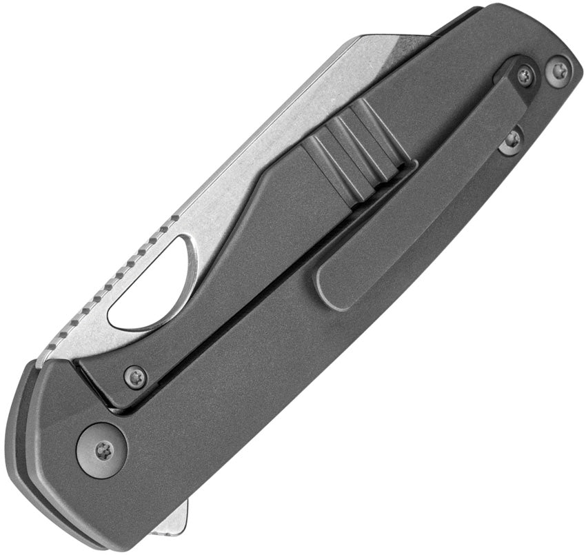 4.25" (10.8cm) closed. 3.25" (8.26cm) stonewash finish S35VN stainless sheepsfoot blade. Gray titanium handle. Extended tang. Thumb pull. Pocket clip. Black nylon pouch. Boxed.