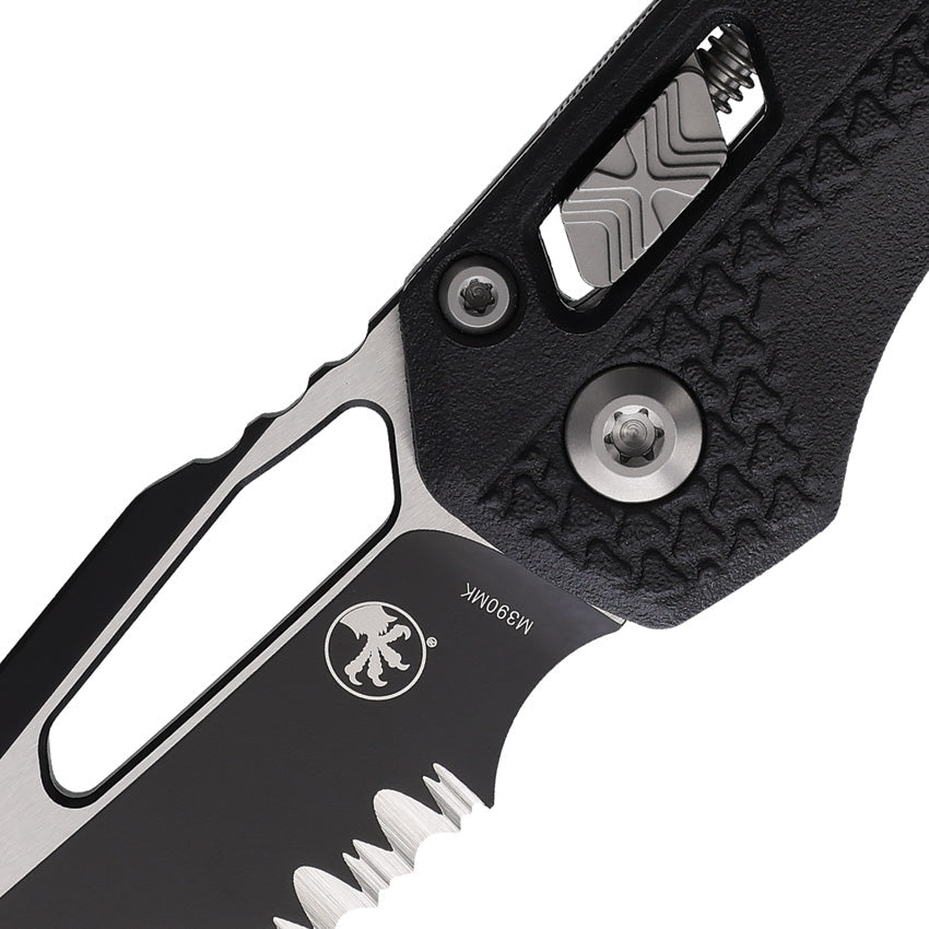 5" (12.7cm) closed. 3.75" (9.53cm) two-tone finish partially serrated Bohler M390MK stainless sheepsfoot blade. Black Tri-Grip polymer handle. Thumb pull. Lanyard hole. Pocket clip. Boxed.