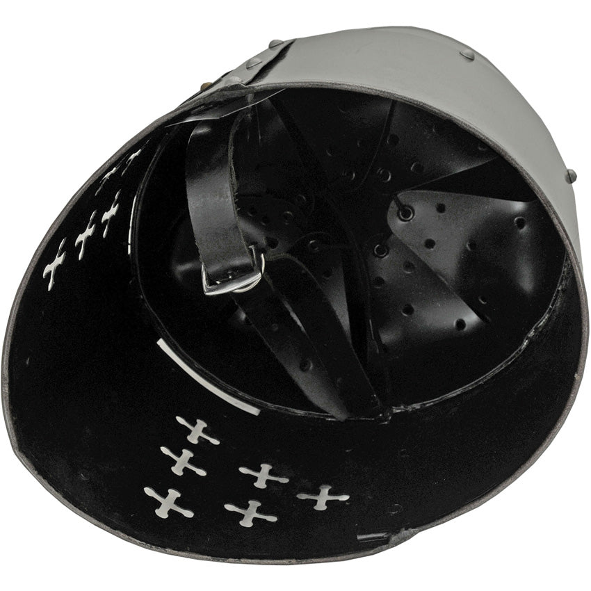 Full size. 18 gauge cold rolled steel construction. Adjustable leather liner. Brass cross nose piece. Boxed.