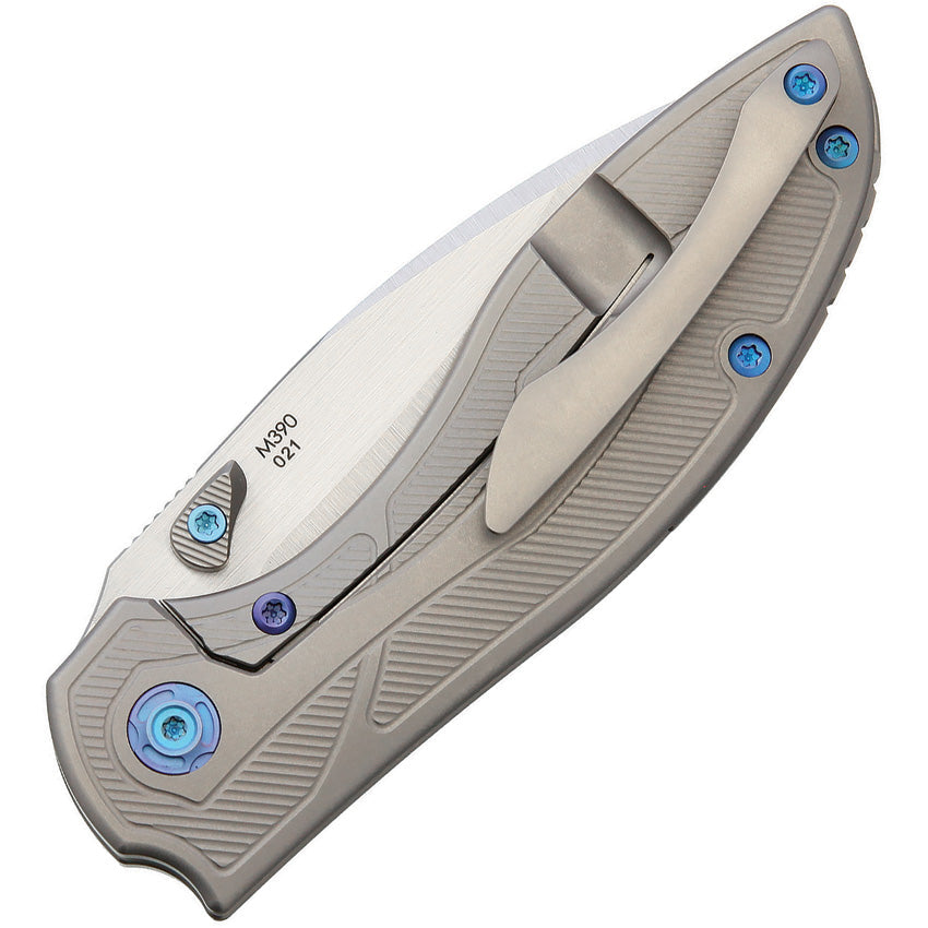 4.25" (10.8cm) closed. 3.25" (8.26cm) satin finish Bohler M390 stainless blade. Gray titanium handle with green micarta inlay. Thumb stud. Pocket clip. Blue finish screws. Black nylon storage case. Boxed.