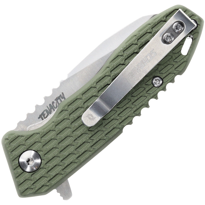 3.5" (8.89cm) closed. 2.5" (6.35cm) satin finish AUS-10A stainless blade. Green sculpted aluminum handle. Extended tang. Lanyard hole. Pocket clip. Clam packed.