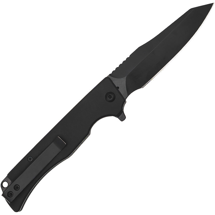 4.25" (10.8cm) closed. 3.13" (7.95cm) black finish D2 tool steel blade. Black G10 handle. Pocket clip. Lanyard hole. Extended tang. Reverse tanto blade. Boxed.
