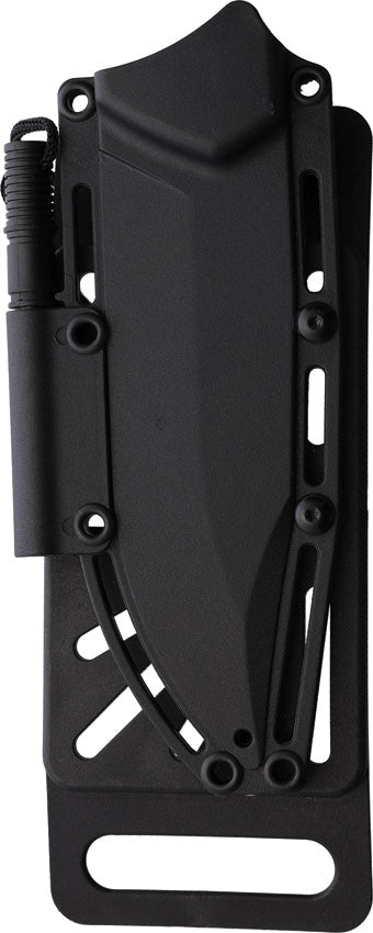 10" (25.4cm) overall. 5" (12.7cm) black finish stainless blade. Black synthetic handle. Full tang. Lanyard hole. Fire steel. Black nylon belt sheath. Boxed.