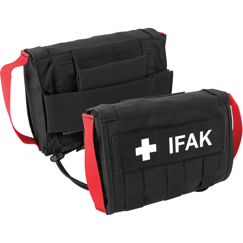 First Aid kit with quick access system. Dimensions: 7" x 6" x 2". Opens out with hook & loop fastening. Patch for color-marking attaching straps that can be written on. Both sides are removable with a panel that can be individually configured. Length-adjustable fastening system for car seat headrests. Suitable for headrests with a vertical circumference of approximately 21" to 25". Included hook & loop adapter for use on bigger headrests. 700D Cordura construction. Color: Black.
