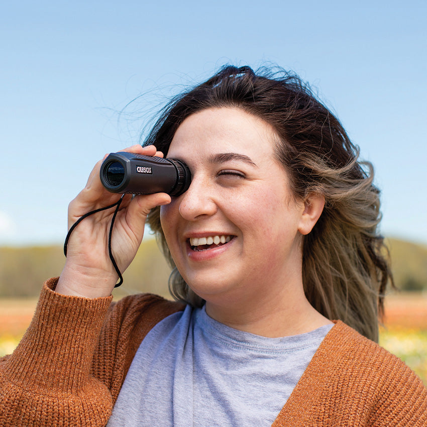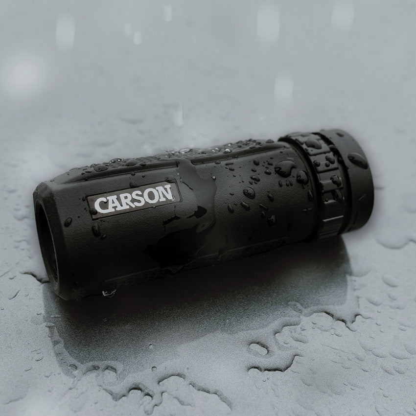 Dimensions: 1.5" x 1.5" x 5". FOV: 273ft. @ 1000yds. Waterproof. Lens cloth. Carry case. Neck strap. Close focus of 4 feet. Versatile zoom for multiple activities. Black nylon storage case. Clam packed.