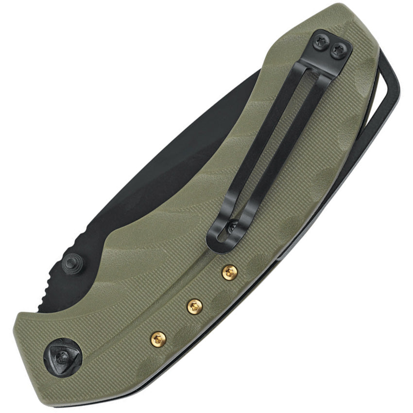 4.5" closed. 3.25" black finish partially serrated 8Cr13MoV stainless blade. Green glass filled nylon handle. Lanyard hole. Thumb pull. Pocket clip. Clam packed.