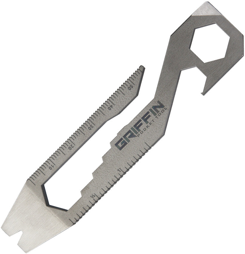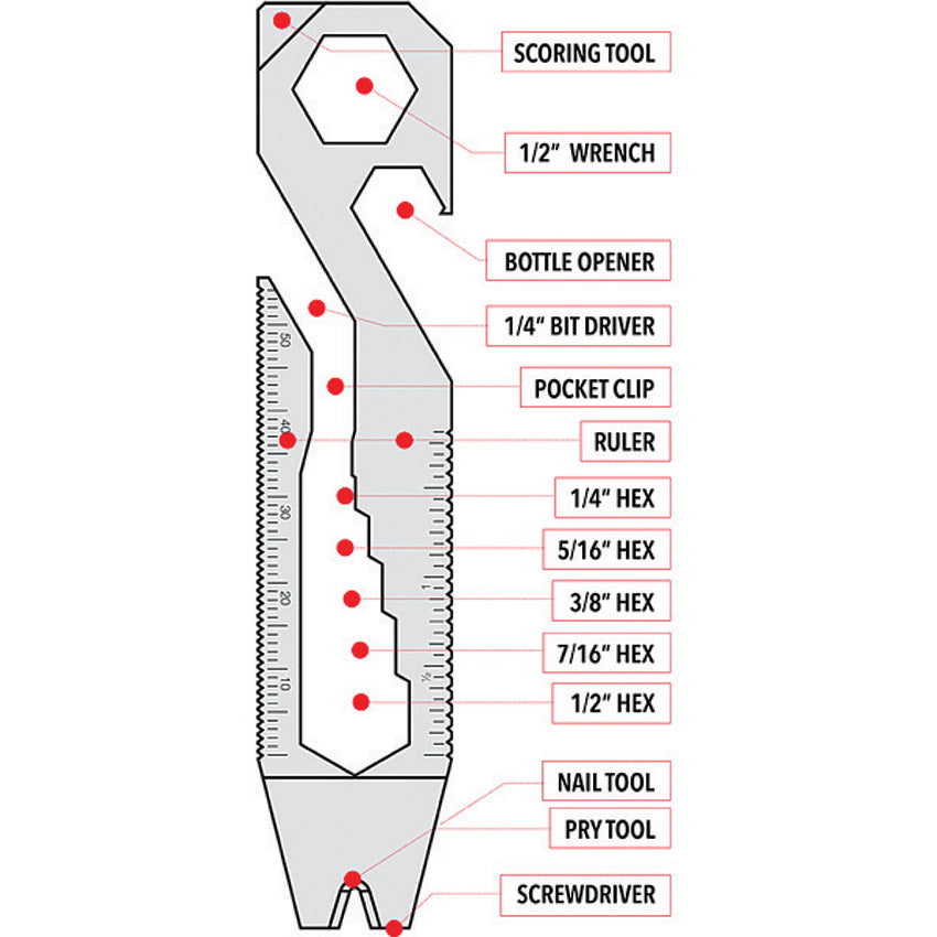 Construction: Titanium; Overall: 4.25"; Additional Tools: Bottle Opener l Nail File l Ruler l Small Screwdriver l Wrench; Other Info: Scoring tool; 1/4" bit driver; pocket clip; Hex driver (1/4"; 5/16"; 3/8"; 7/16"; 1/2"); and pry tool. Hang Packaged.