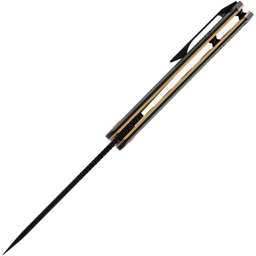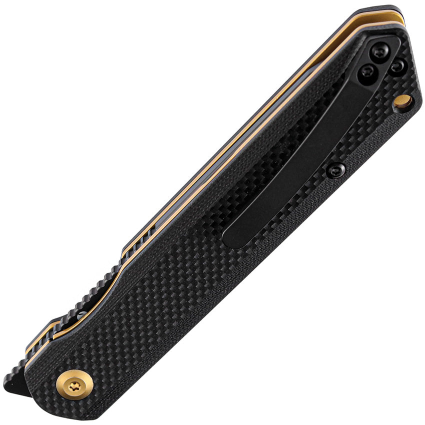 4.5" (11.43cm) closed. 3.5" (8.89cm) black coated 154CM stainless blade. Black G10 handle. Extended tang. Lanyard hole. Pocket clip. Gold stainless liners. Black nylon pouch. Boxed.