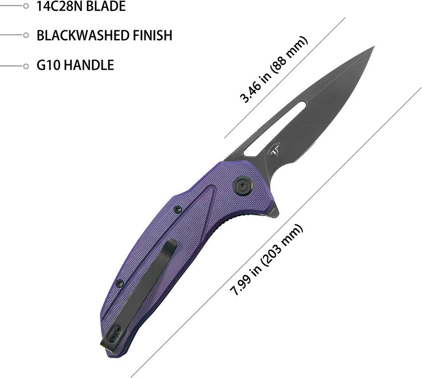 4.5" (11.43cm) closed. 3.5" (8.89cm) black stonewash finish 14C28N Sandvik stainless blade. Purple G10 handle. Thumb pull. Extended tang. Pocket clip. Boxed.