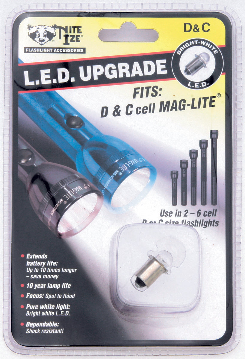 For D & C Cell Maglites. Bright white LED. Extends battery life up to 10 times. 10 year lamp life. Spot to flood beam. Simple to replace. Hang packaged.