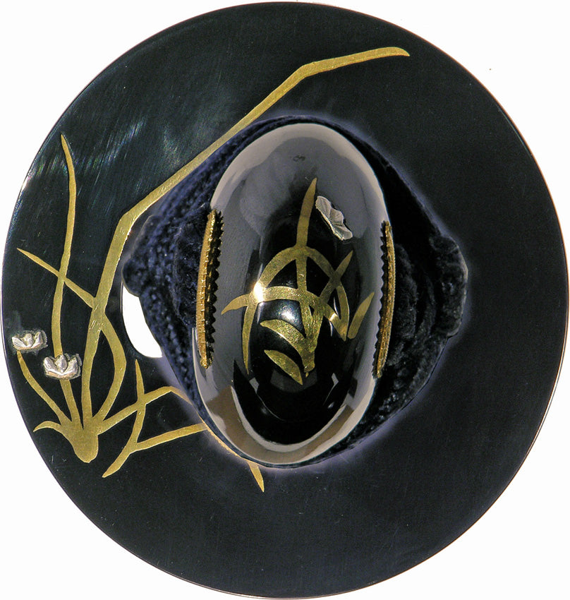 The blackened iron tsuba of the Orchid Katana showcases a stunning orchid and butterfly decoration inlaid in silver, brass, and copper. This intricate design adds a touch of elegance and beauty to the sword, making it a true work of art.