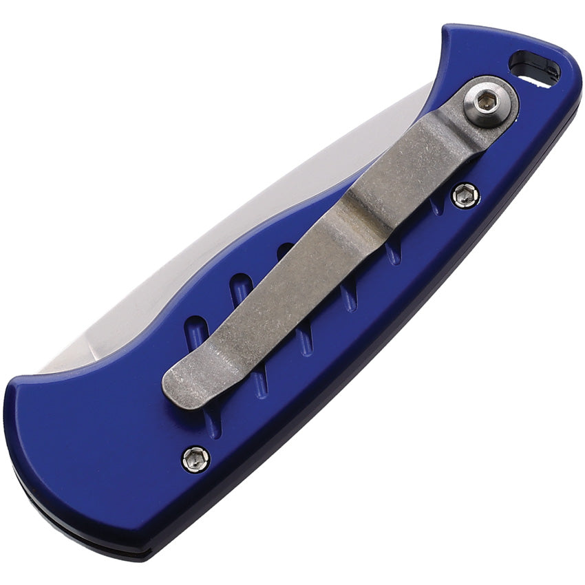 Automatic opening. 3.38" (8.59cm) closed. 2.5" (6.35cm) mirror finish 154CM stainless blade. Blue aluminum handle. Lanyard hole. Pocket clip. Boxed.