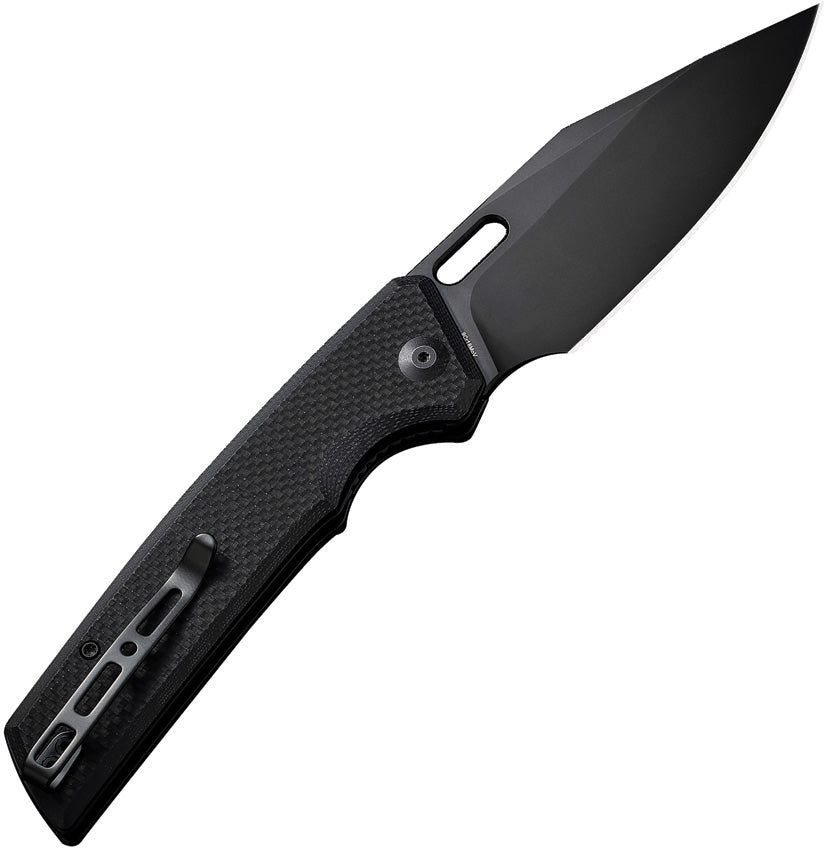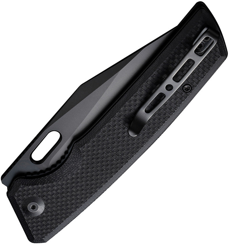 4.75" (12.07cm) closed. 3.75" (9.53cm) black stonewash finish 9Cr18MoV stainless blade. Black G10 handle. Thumb pull. Pocket clip. Black nylon zippered storage case. Boxed.