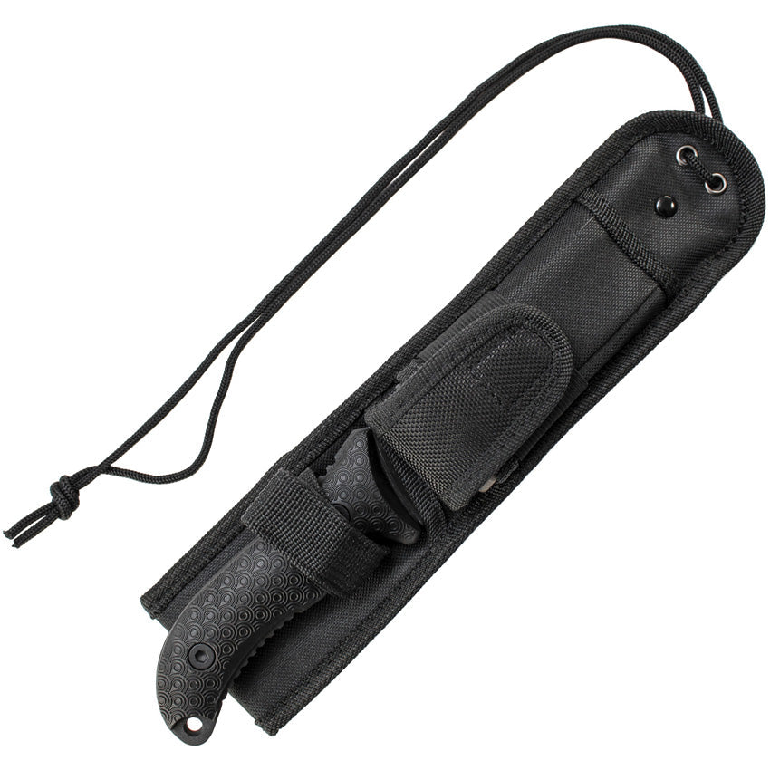 10.25" (26.04cm) overall. 5.25" (13.34cm) black powder coated 1095HC steel drop point blade. Black textured TPE handle. Full tang. Lanyard hole. Includes 4" overall firestarter with 2.38" ferro rod, striker, and diamond sharpener. Black nylon belt sheath. Boxed.