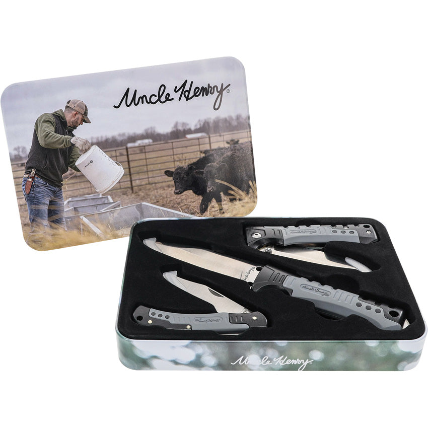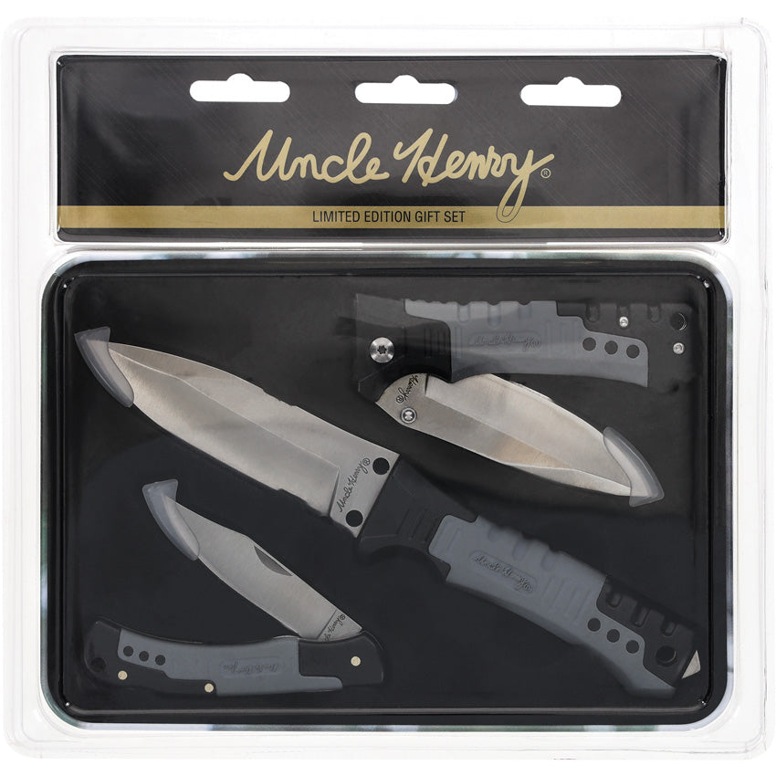 Uncle Henry. Satin finish stainless blade. Black and gray rubberized nylon handle. Includes: 8.13" overall fixed blade with 3.5" blade and glass breaker; 4" closed linerlock with 2.5" blade; 3.5" closed linerlock with 2.5" clip point blade. Clam packed.