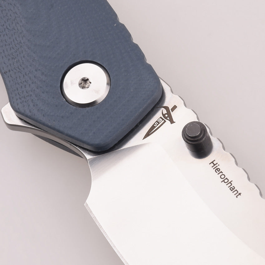 4.5" (11.43cm) closed. 3.38" (8.59cm) satin finish 154CM stainless drop point blade. Blue-Gray G10 handle. Thumb stud. Extended tang. Pocket clip. Black nylon sheath. Boxed.