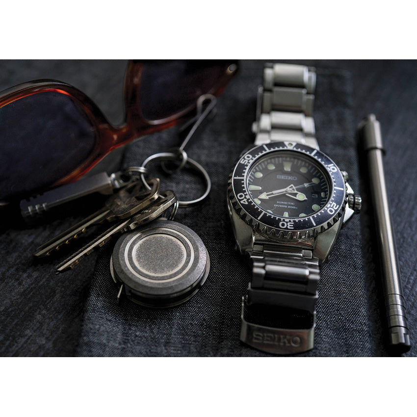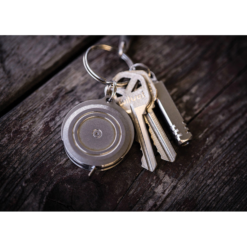 .74oz. Tumbled finish titanium body. 1.25" diameter; 0.38" wide without attachment clip. Only slightly larger than a U. S. Quarter. Comes with removable stainless keychain attachment clip. Replaceable stainless spring steel 3' measuring tape with high contrast black on white markings. Imperial and Metric units. Boxed.