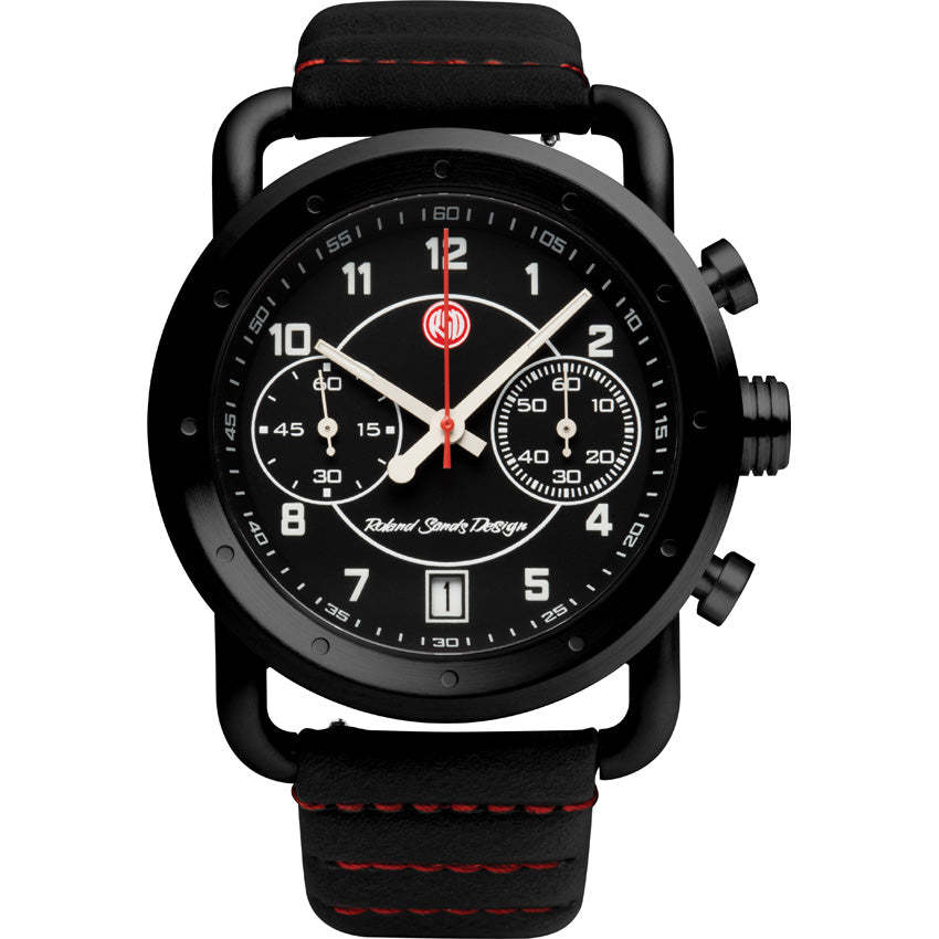 43mm 316L stainless case with fixed bezel. Stainless push crown and screw-in case back. K1 flat hardened mineral crystal. Japanese quartz (Miyota 6S21) 2 eye chronograph with date movement. Black dial with Lume on numerals and hour and minute hands (glows blue). 100m water resistant. Black Horween leather strap with red stitching and easy change spring bar and signature buckle. Boxed.