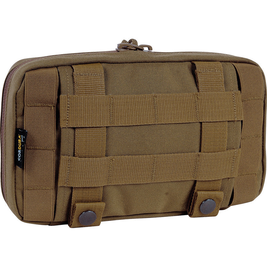 Dimensions: 9" x 6" x 1.5". Various compartments. Fixation loop for flashlights on back. Organizer for memory cards. Transparent storage pockets for documents. ID card holder. Cord for adjustable opening angle. Hook and loop strip. Requires 4 MOLLE loops. Cordura construction. Color: Coyote Brown.