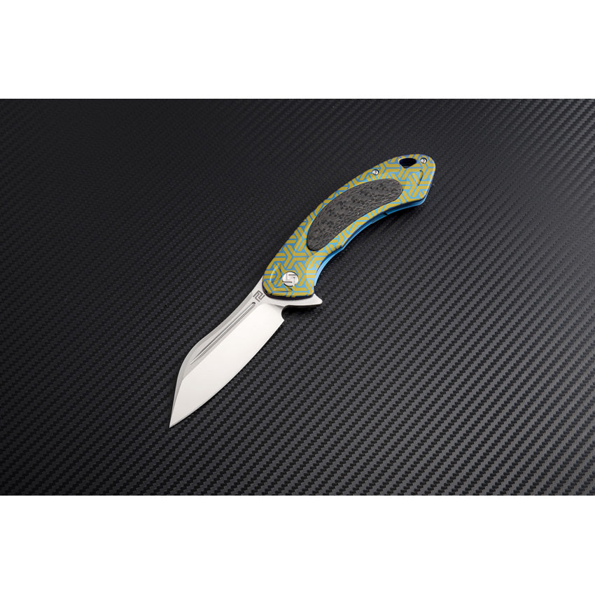 5" closed. 3.63" satin finish S35VN stainless blade. Blue titanium handle with carbon fiber onlay. Extended tang. Lanyard hole. Pocket clip. Metal tin. Black nylon zippered storage case. Boxed.