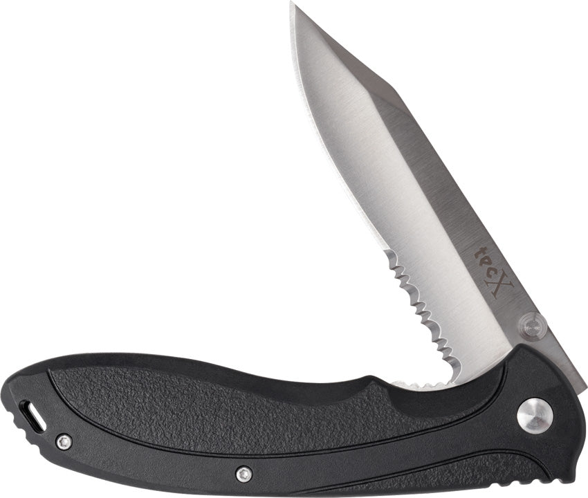 3.75" (9.53cm) closed. 2.75" (6.99cm) satin finish partially serrated stainless blade. Black nylon handle. Thumb stud. Lanyard hole. Pocket clip. Boxed.