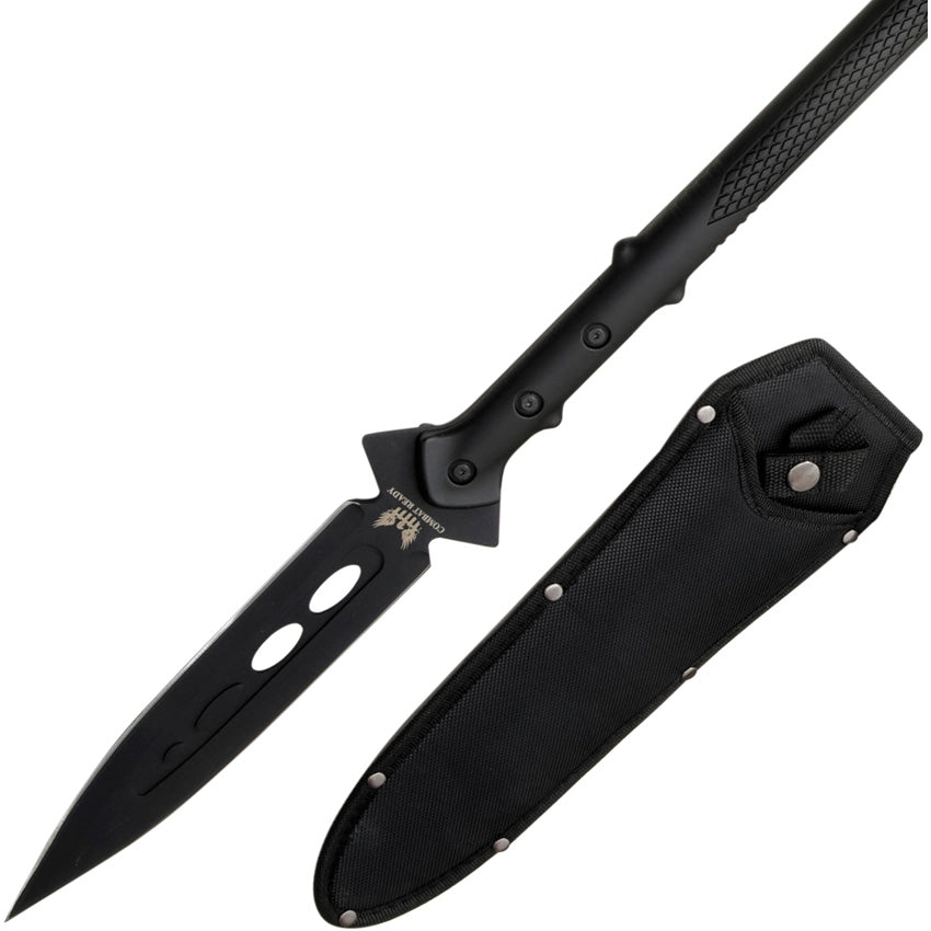 46.5" overall. 9.5" (24.13cm) black stonewash finish stainless blade. Black synthetic handle. Black nylon belt sheath. Gift tin.