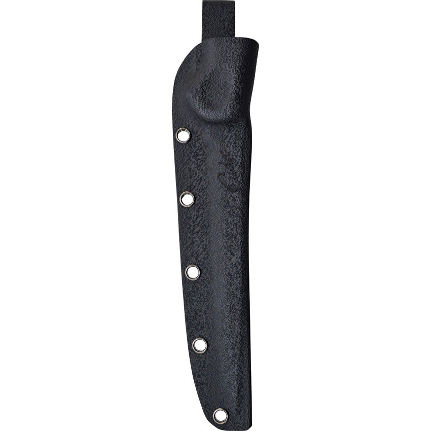 Overall: 12"; Blade: 6" l 40A Carpenter Steel l Standard Edge l Black Finish; Handle: Micarta; Other Info: Full Tang. Precision ground flex edge. Blue and black handles. Black molded belt sheath. Hang Packaged.