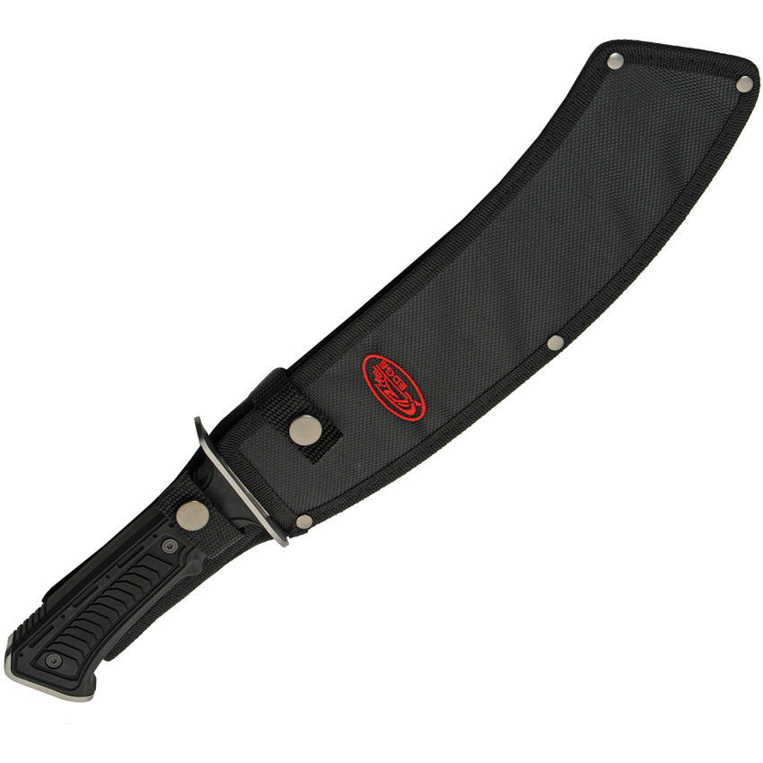 16.25" (41.28cm) overall. 10.75" (27.31cm) satin finish stainless blade. Black rubberized ABS handle. Black nylon belt sheath. Boxed.