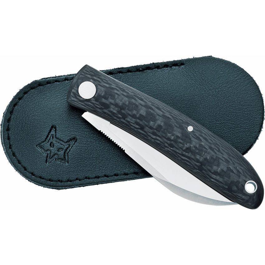3.25" (8.26cm) closed. 2.88" (7.32cm) satin finish Bohler M390 stainless blade. Carbon fiber handle. Lanyard hole. Slip joint. Black leather pouch. Boxed.