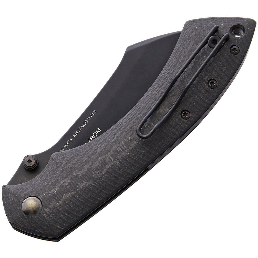 4.88" closed. 3.5" black finish Bohler N690 stainless blade. Carbon fiber handle. Thumb stud. Lanyard hole. Pocket clip. Black nylon zippered storage case. Boxed.